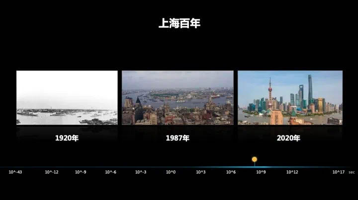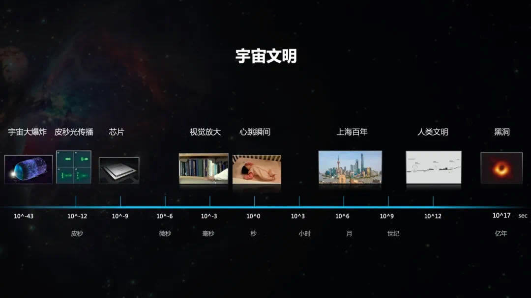 The smallest unit of time we know in the universe is ten to the minus forty-three seconds after the Big Bang. From this smallest unit of time to the instant of a human heartbeat of 1 second, to the history of a city, to the history of mankind, to the more distant history of the galaxy that humans have tried to observe hundreds of millions of years ago, this is the development and change of cosmic civilization from the perspective of the time axis and the physical world.