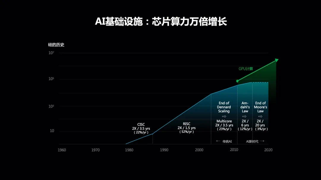 In the past few decades, the development of computing power has been divided into two stages, one is the blue curve, and the other is the green curve. We call them the old or traditional era chips, and the new era chips based on GPUs or customized for AI computing. The blue curve is based on the traditional Moore's Law, with performance doubling every 18-24 months; the green curve is the accelerated super Moore era chip computing power, which has increased by nearly ten thousand times in the past few years, and the computing power of a single GPU is a thousand times more than that based on CPUs.